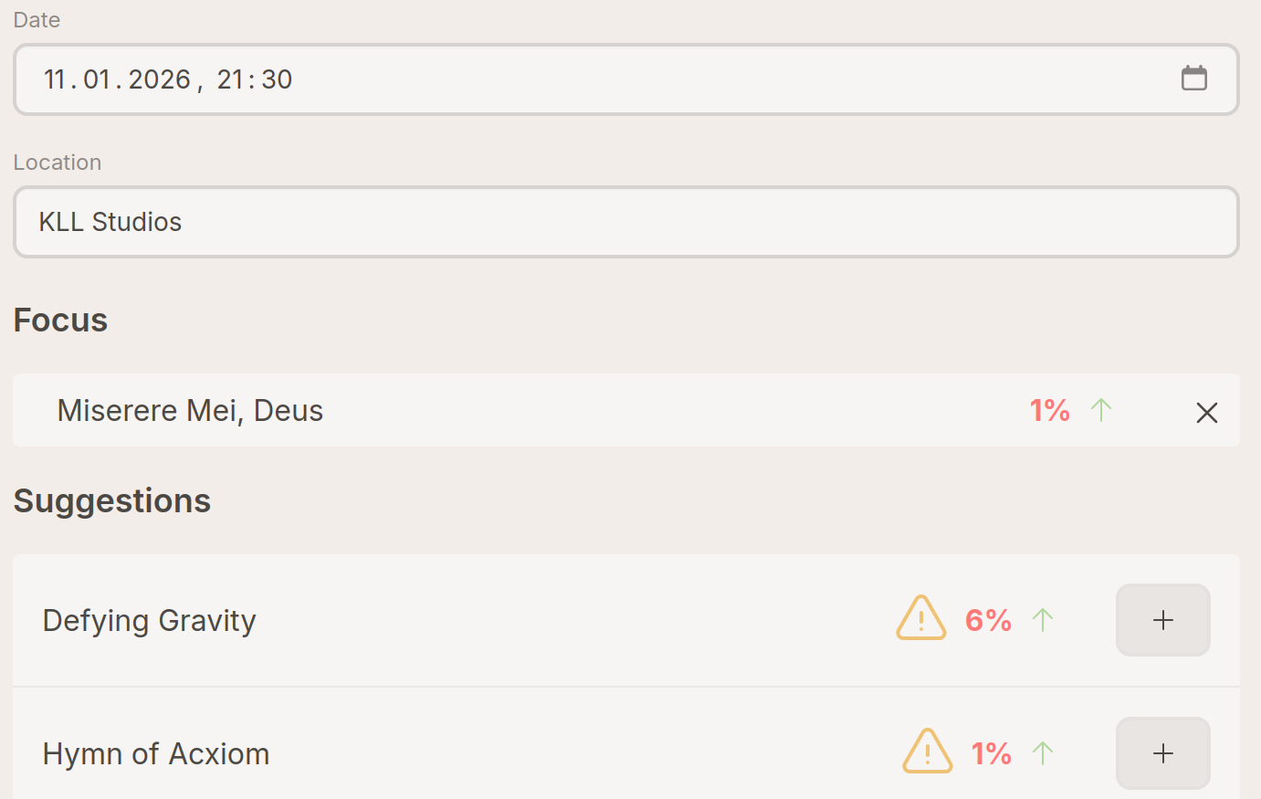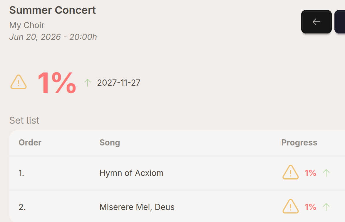 Estimated readiness dates are calculated to let you know whether the group is on track for the next concert, while warnings alert you to assignments lacking progress.