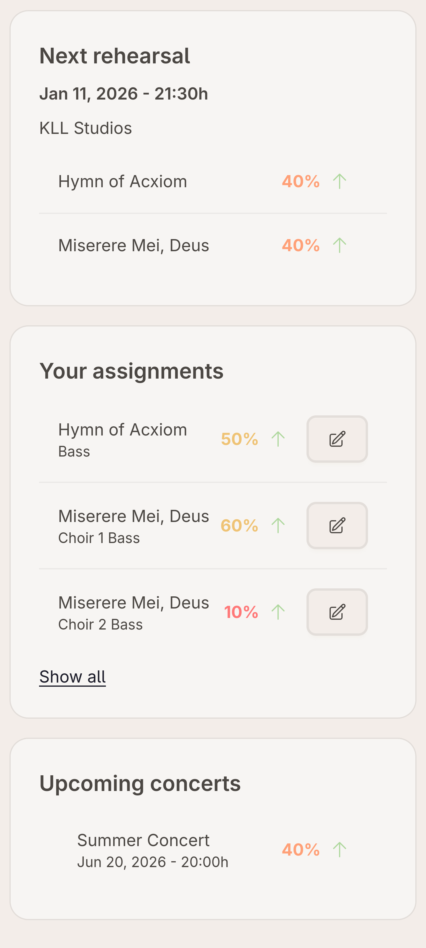 Learning trends are calculated on the member, part and choir level, giving you clear indicators what to focus on.